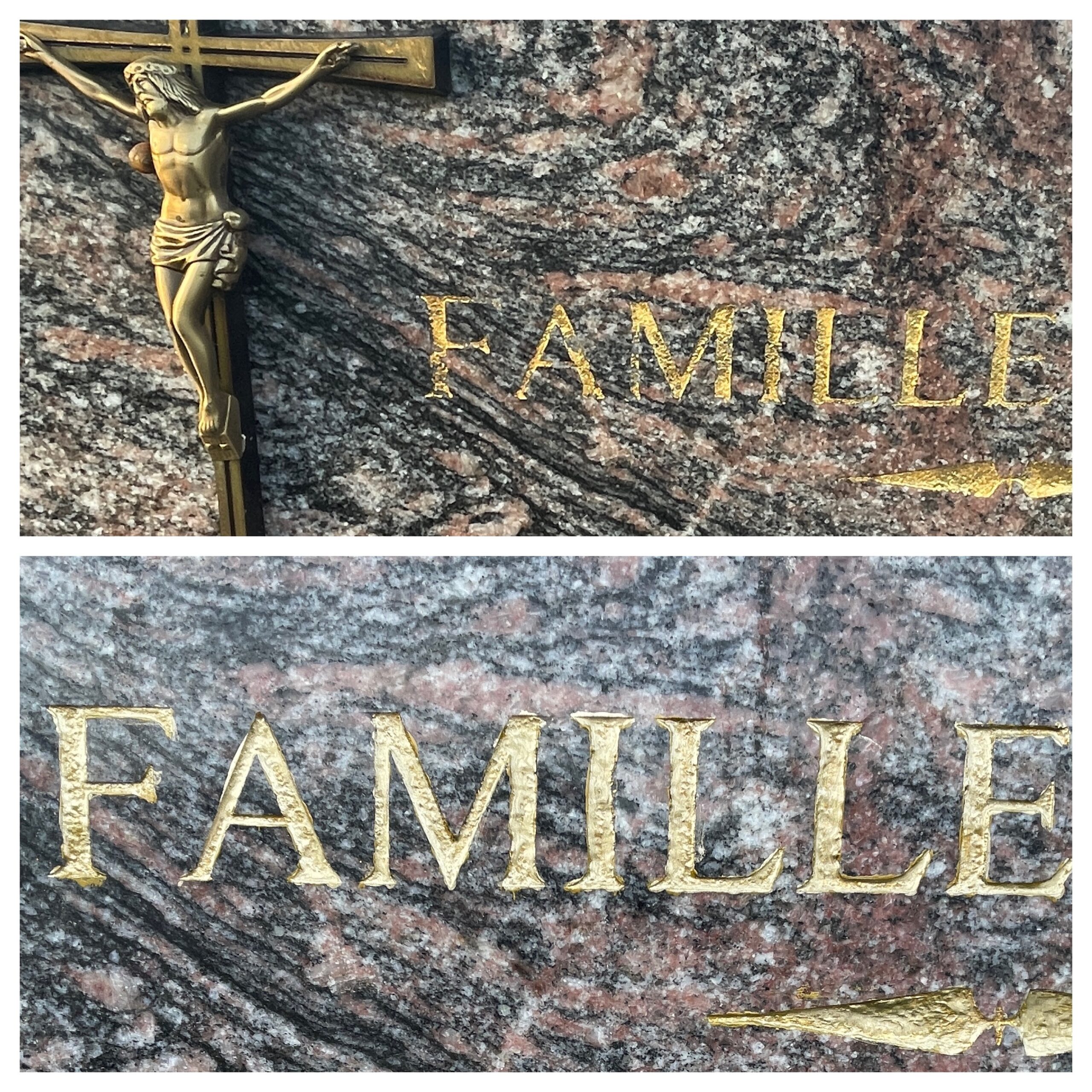 Les inscriptions sur la tombe sont en train de s’effacer ? Vous pouvez choisir de leur redonner de l’éclat avec le rechampissage et la feuille d’or. Je vous propose ces deux prestations avec Entre Cime et Terres sur les cimetières de Brest et alentours du Finsitère Nord.